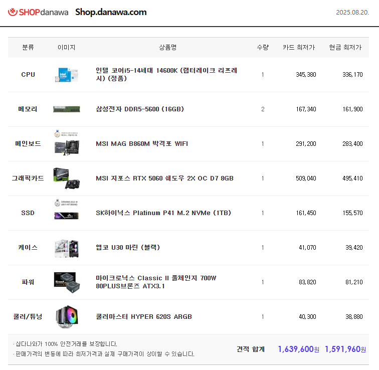 아래 견적서에 메인보드를 변경 및 추천 상품이 포함되어 있으니 참고해 주세요