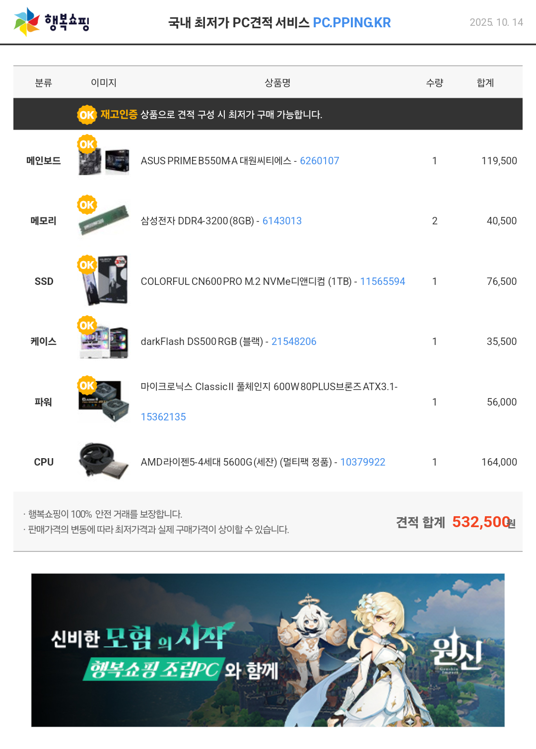 견적 구성 호환성 문제 없게 잘 구성하였으나 CPU, 메인보드 제품이 현재 품절입니다.
