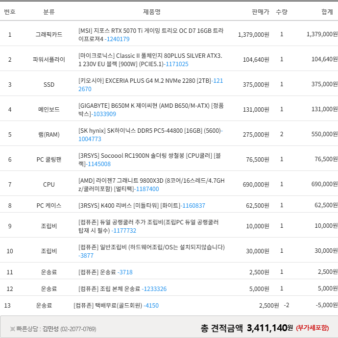 견적 확인 결과 9800X3D의 경우 B650 보드 보다는 B850 보드로 구성하시는 것을 권장드립니다.