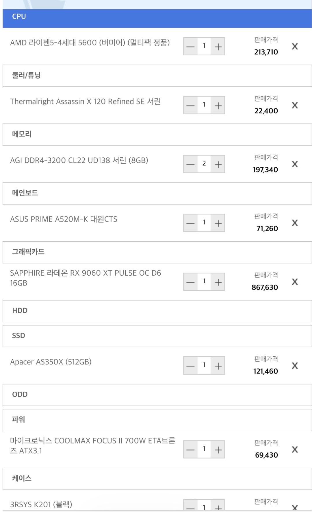 5600에 RX 9060 XT 조합은 현재 170만원대의 견적으로는